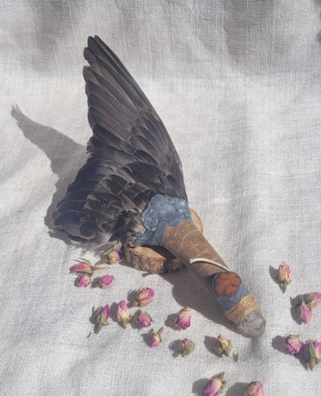 בחלקה התחתון של הידית מחוברות חתיכות מעץ האיווסקה –שמכניסה למניפה אנרגיה של רפואה, התחדשות ,לידה מחדש והתחברות לאסטרל.