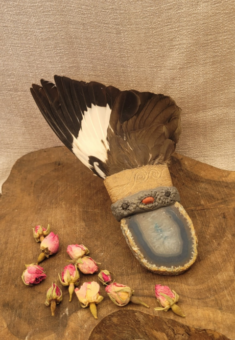 ידית המניפה כולה הינה מקריסטל אגת כחולה- אשר מעניקה לנו שלווה פנימית עמוקה ונעימה תוך חיזוק יכולת התקשורת באופן רגוע וזורם.משפיעה על צ'אקרת הגרון וטובה מאד לאיזון כללי בכל ההרבדים בדגש על יכולת הביטוי ועל היכולת לזמן אהבה ולהתחבר לעצמנו.